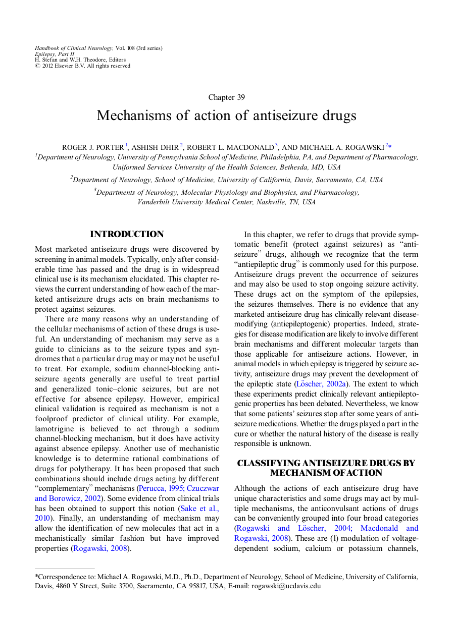 (#3-CV,p19,#135) Porter RJ, Dhir A, Rogawski M, Macdonald R. AED mechanisms and principles of drug treatment. In Stefan H, and Theodore W (Ed): Handbook of Clinical Neurology, 3rd series, Epilepsies Part 2: Treatment. Elsevier, Edinburgh, 2012, 663-681.